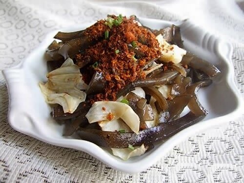 3,锅下花生油烧至6成热下姜丝炒香,下磁粑辣椒炒至油红,下莲花白菜丝炒断生再下切好的苕粉、蒜苗段翻炒1分钟左右,加上盐、酱油、花椒面、味精、葱花炒均入味出锅。