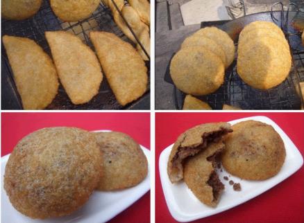 3.从糯米面团中扯下约50克揉成园团,在铁皮上再摊成饼状把豆沙球包起来再压扁,双手四指托底大姆指转圈挤压中间,形成园窝形;甜馅的为了便于区别可包成半圆形。