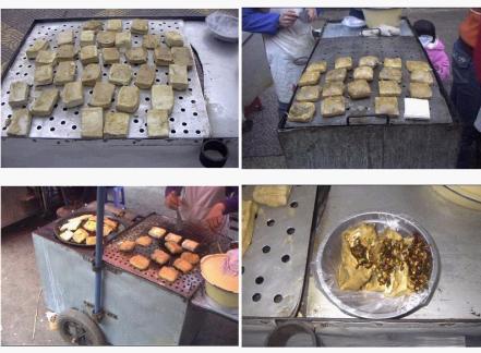 3.准备好特制的烧有锯木面火的铁板烤炉,把发酵好的豆腐排在铁板上烘烤,边烤边翻动,烤至豆腐鼓涨起来,外皮金黄,滋滋冒热气,用铲刀铲起,用竹片在侧面划破开口,把拌好的佐料放入口子里,即可食用。