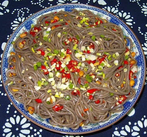 2.加入青红椒粒、蒜茸、精盐、味精、酱油、陈醋、红油、木姜油、香油拌匀,撒油炸黄豆、葱花即成。
