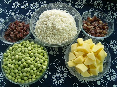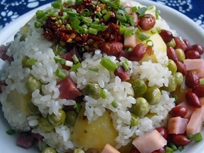 安顺豌豆腊肠洋芋糯米饭用料:糯米1000克,瘦腊肉150克,广式香肠150克,鲜豌豆400克,土豆300克,花生油50克,精盐15克。