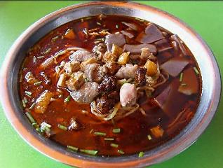它的主要原料是猪大肠、新鲜的猪血旺和擀制的鸡蛋面条。配料和调料有20多种。主料和配料的制作都非常考究。猪大肠越肥越好,里外洗净,用盐、醋反复揉搓,将肠壁的粘状物揉净,再用清水反复浸漂,除去腥味。然后放在木盆或瓷瓦盆中(忌放金属器皿内),把肠子花椒、山奈、八角放入锅内煮熟,捞出切成片。然后又用姜、葱、山奈、八角放入砂锅小火慢炖。血旺要嫩,也切成片吃时在汤锅里放一下。配料如脆哨即用猪糟头肉或五花肉,用以鸡蛋面、猪肠、血旺、脆哨四大原料为本,再调放鸡汤、红油辣椒等佐料,经12道工序,才出成品一份。其汤色鲜红、面条蛋黄、肥肠粉白,葱花嫩绿,豆芽金黄,一碗捧出,使人顿感赏心悦目,待举箸下咽,更是满口生香。面条脆细爽口、食不粘牙;肉哨香脆、肠旺鲜嫩;辣而不猛、油而不腻;汤鲜味美、回味悠长。