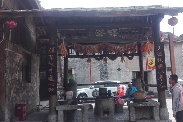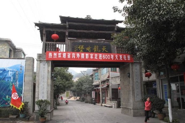 天龙镇,是贵州民俗旅游胜地之一,天龙镇曾是明太祖朱元璋军队迁徒屯兵之地,至今仍保持古扑厚重的明代遗风古俗。这里的天龙地戏演绎的是600年前杨家将、穆桂英等故事。戏剧粗犷、独特,耐人寻味,被世人和专业人士称为:“戏剧活化石”。演员头戴木雕傩戏脸壳,面遮黑纱,身穿长衫,肩插令旗,手持刀棍,或群舞或单搏,透露出英勇顽强与善战克敌的精神。