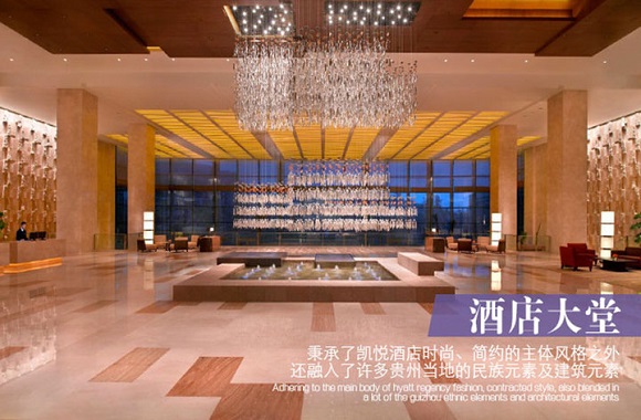 酒店大堂是目前贵州酒店业中面积最大,设计最为宏伟的大堂,它的设计融入了很多的贵州当地原生态、石板、瀑布等元素;大堂顶灯独特的吊缀设计,采用了贵州少数民族苗族女子盛装配饰的元素,象征着苗族女子盛装出迎远方的贵宾。酒店的户外花园在贵阳酒店市场来说也是极具特色的,很好的将自然、建筑和人类活动相互结合起来,达到和谐完美,生态良好、景色如画的境界。更值得一提的是为了融入贵州的景观文化,建造了一座仿真的“黄果树瀑布”可供宾客观赏。花园整体的一个设计理念就是想让宾客置身于自然的风韵中,感受到山中有水,水中有花,花有芬芳的艺术境界。