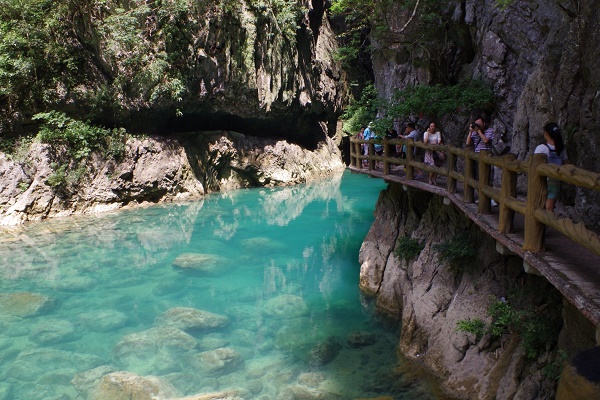 大七孔景区以峡谷为奇。游人在大七孔桥旁登舟,溯流而上便进入“天神峡谷”。但见两岸峭壁耸立、危崖层叠,绝壁上附着朵朵钟乳、层层翠林,宛若一幅色彩斑斓的油画。