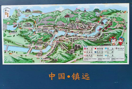 舞阳河上有两座大桥,西侧是新修的,当地人称为新大桥,东侧的祝圣桥是镇远古城的标志性建筑,当地人称之为老大桥。新老大桥之间,既是传统意义上的古镇地界,古镇由首尾相接的三条街道(新中街、兴隆街和顺城街)构成,街道两边与其他古镇类似,都是客栈、餐馆和店铺。