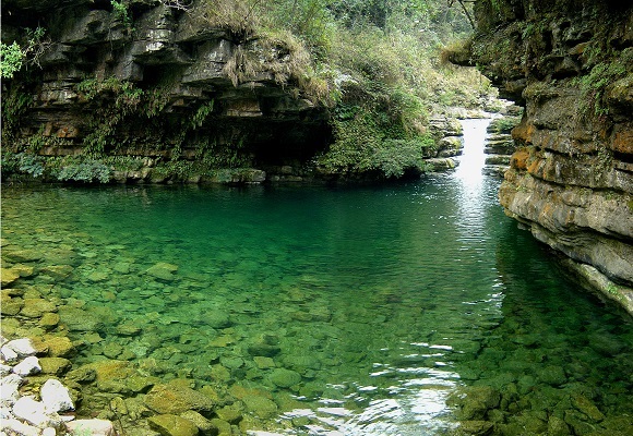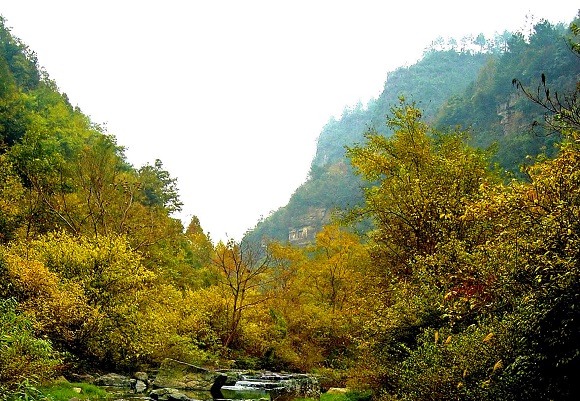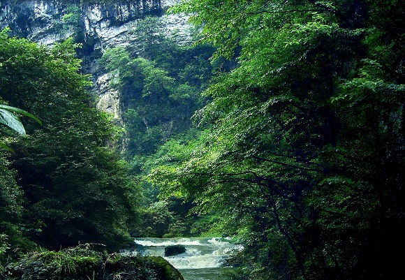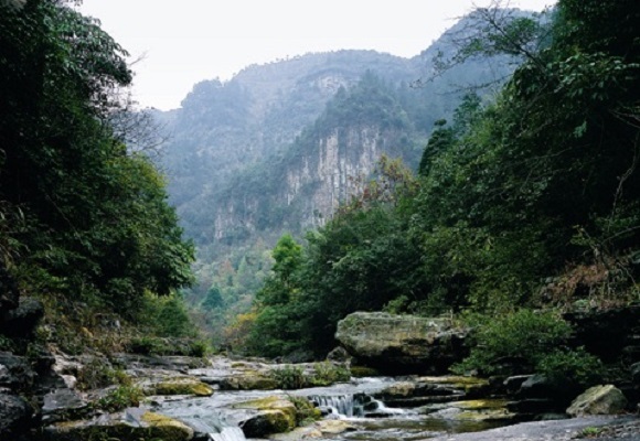 谷底一条清澈的溪水在树丛和巨石之间流淌,河内有大鲵和游鱼。在峡谷内沿溪水徒步而行,寻幽访胜,回归自然,妙趣横生。