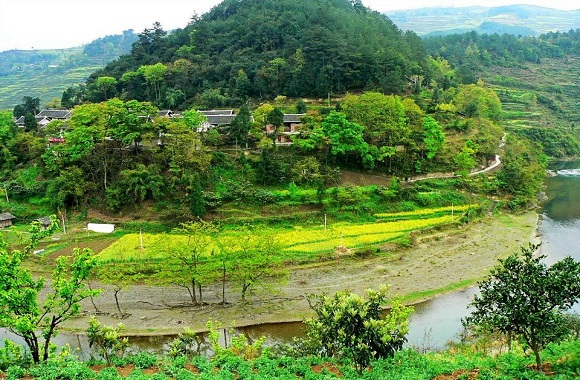在禾丰底窝坝,清龙河于此伸了一个优美的懒腰绕坝而过。春季,层层叠叠的油菜花灿若金色的朝霞,秋季,沉甸甸的水稻如金黄的稻浪随风起伏。每个季节的底窝坝都被大自然装扮得丰润而醇厚,从观景台俯瞰,整个田坝在清龙河的包围下形似盆而色金黄,故名“玉水金盆”。