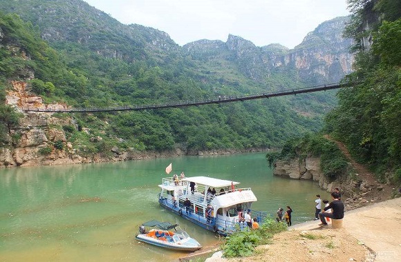 特别提示:1、关岭花江大峡谷确实太美,但是需要坐船游览才能体会。花江两边的高山和美景,坐在船上,感觉一座座大山就像一扇扇门,打开又合上。特别期待游船开过每一座大山后那一瞬间的美景,真的是不虚此行。铁索桥很稳,很牢固,安全措施做的很好,桥上走个来回也就2、3分钟。 2、去景点的交通确实是个大问题。去花江大峡谷必须得自驾,而且驾龄需要5年以上,一路的山路,关键是高山,路旁边就是悬崖,各种弯道,还没有广角镜面。所以天黑前必须要从山里出来,不然天黑山路开车就太危险了。 3、目的地到底应该在哪里!实际上是这样,在开车快到景点的时候,有一个大弯道,路旁有指示牌,显示向左是坐船游;向右是去售票处。我们属于老实人,就向右去了售票处,我去,整个一个开发中的景区,从售票处到铁索桥那段路特别难走,台阶很不好走,有老人小孩的就可以放弃了,免得受伤。时间上花了半个小时下山走到铁索桥。铁索桥对面就有码头,我们实在不想再爬那段陆返回停车场,就坐船去下游,然后花100元包车再回到售票处。后来才知道,在开车路过岔路口的时候,就应该向左直接去坐船,码头40元/人的船票,游船会把游客送到上游的铁索桥,玩半小时,然后再返回码头。全程不需要购买门票、不需要下山走那段崎岖山路、而且节省时间和体力、性价比最高。