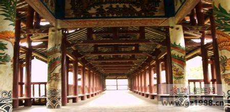 此外,“楼叶,楼”四柱绘有4条青龙抱柱,顶层花板又绘有龙虎鹤牛齐欢图案。桥两头柱壁上画了三幅楹联。 另外在北面的平地上配建有——座风雨主亭,高约9米,为6角攒尖顶,同样具有浓厚的民族特色。