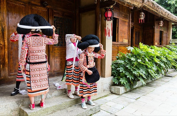 长角苗妇女们用木桶背水,用稻草制成针线包。女孩五六岁就要学绣花,八九岁便操持着学蜡染,先是用扁平的蜡刀点沾蜡液,在细白布上勾画记熟的图案,然后将画好的布放入染缸染色,再用水煮去蜡,一块上好的“花布”便呈现出来了 。